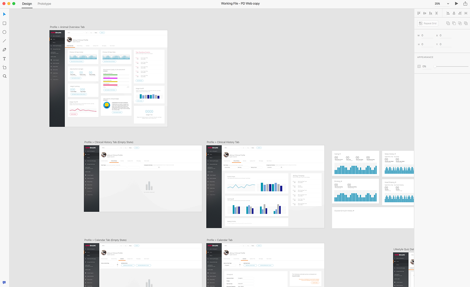 The data collected from the wearable device needed to be integrated into the existing mobile and web application for the owners and vets to see. Adobe and Sketch were very heavily to produce wireframes and prototypes in this stage. Using our existing design language system, I provided Adobe XD and Sketch Files for new screens and states. This included UX specifications for colours, fonts, etc.